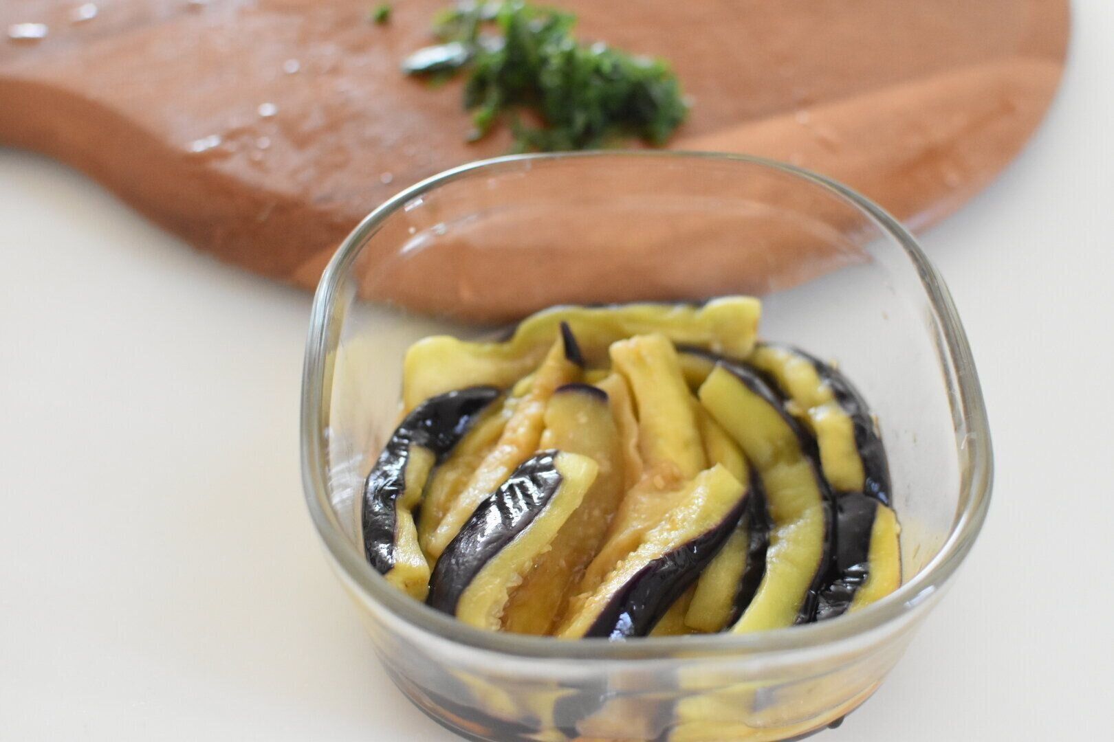 あらかじめごま油をなじませてから電子レンジで加熱することにより、なすに含まれる脂溶性ビタミンの吸収率をアップさせることができます。