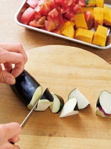 かぼちゃは3cm角に切る。トマトは2cm角に切る。なすは乱切りにして水にさっとさらす。