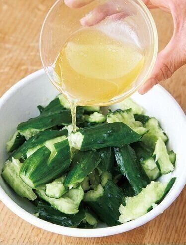 きゅうりはたたいてから長さ2~3cmに手で割ってボウルに入れる。