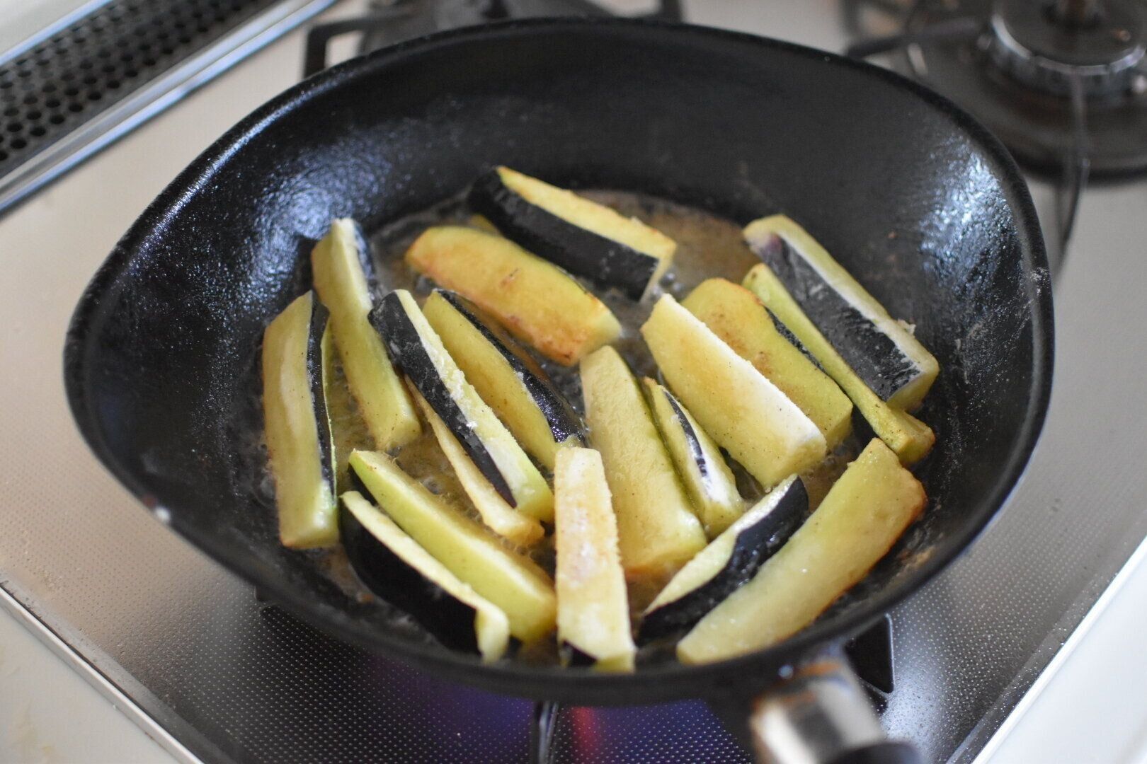 揚げなすをおいしくつくるためには、揚げ油の温度にも意識するのが大切。