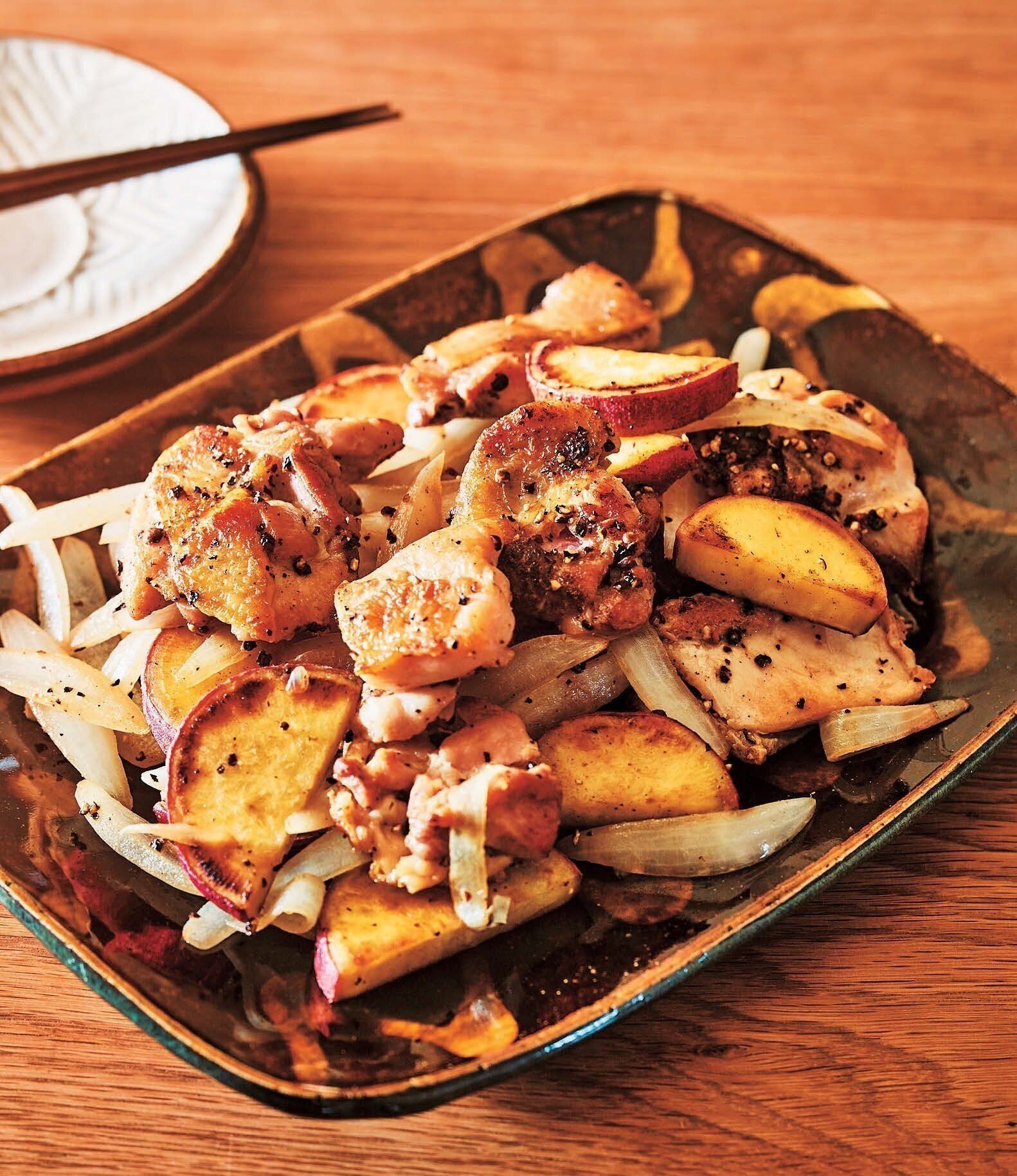 - 〈鶏肉とさつまいものブラックペッパー炒め〉ほくっと甘いさつまいもはキリッとした味で