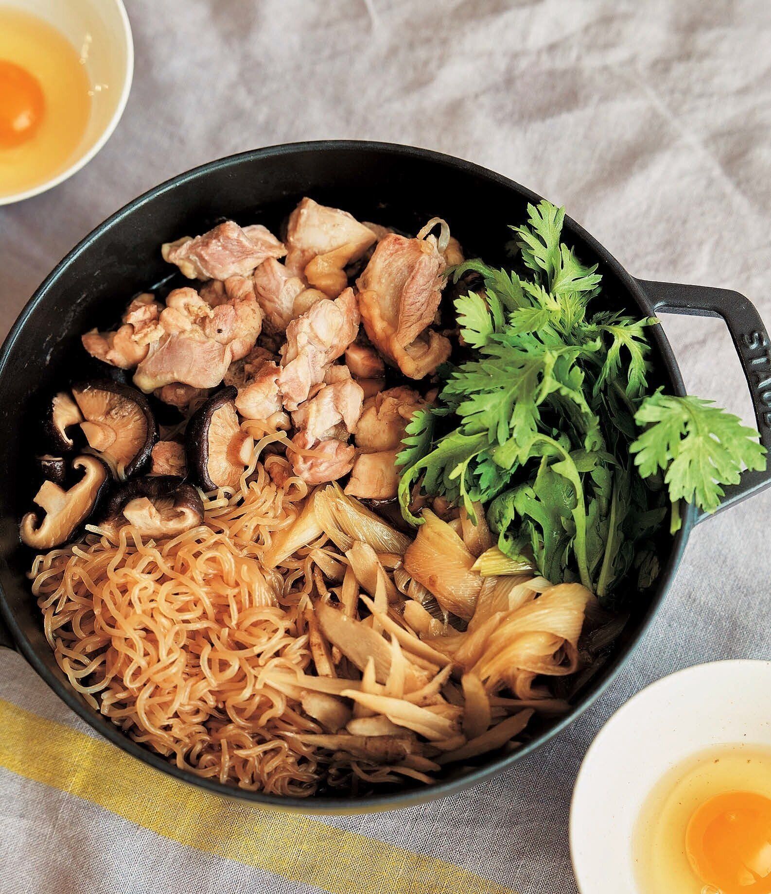 具材が煮えたら春菊を加えてさっと煮る。器に卵を入れて溶きほぐし、つけながら食べる。(野口)