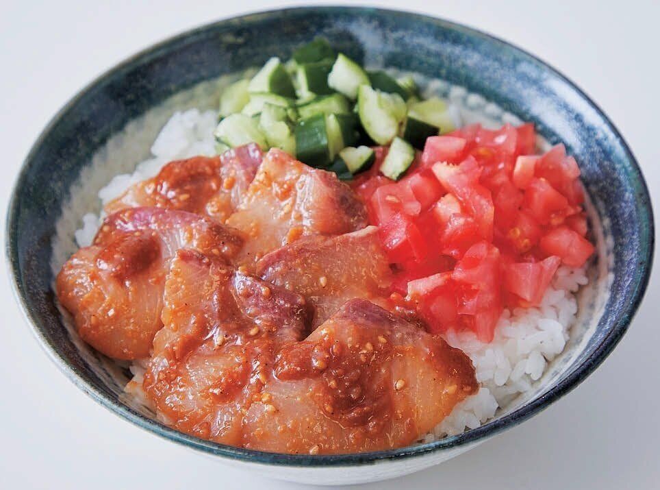ぶり(刺し身用)1さく(150~200g)は薄切りにし、ごまみそだれであえる。温かいご飯にぶりをのせ、残ったたれもかけ、食べやすく切ったきゅうりとトマトを添える。