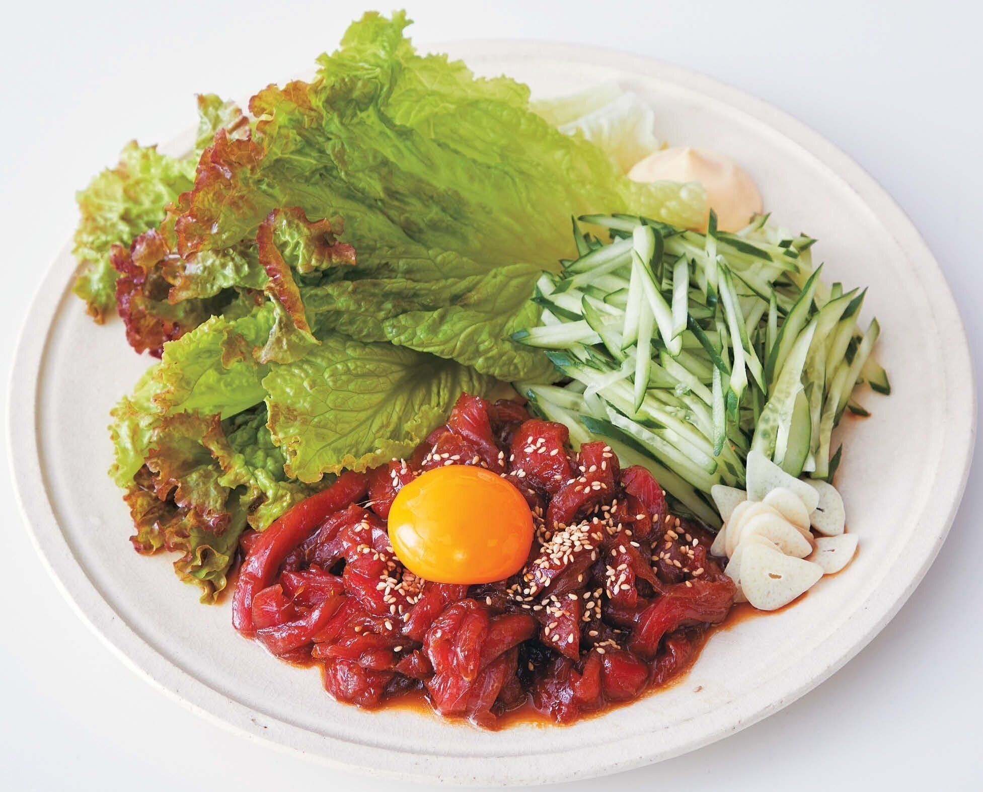 まぐろ(刺し身用)1さく(150~200g)は7~8mm角の棒状に切り、ユッケだれであえて卵黄をのせ、白いりごまをふる。サニーレタス、きゅうり、にんにくを添え、サニーレタスでまぐろと野菜を巻きながら食べる。好みでマヨネーズをつけても。