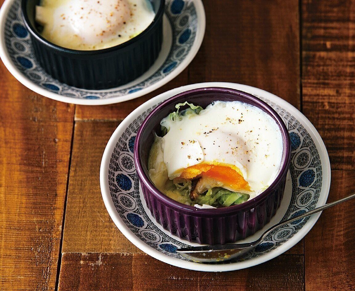 直径8cmのココットにキャベツ、エリンギを入れ、塩少々をふる。チーズをのせ、卵を割り入れる。フライパンにペーパータオル(二重にして。またはふきん)を敷いてココットをのせ、水を深さ1cmほど入れる。ふたをして中火にかけ、沸騰したら弱めの中火にして7分蒸し、黒こしょう少々をふる。