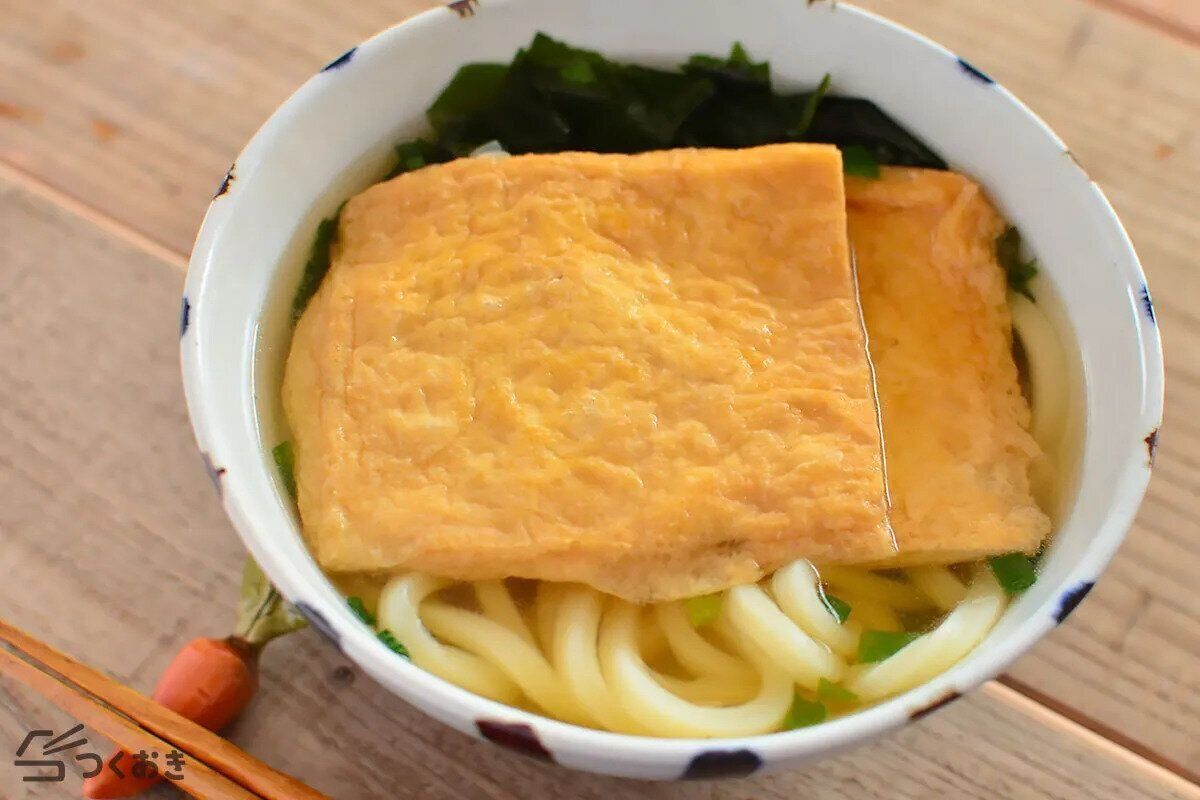 砂糖、醤油などでふっくらと油揚げを煮含めるだけで、温かいうどんと好相性のおあげが完成します。じゅわーっと染み出す甘辛い味に、疲れも癒されますよ。ねぎやわかめなどを添えてどうぞ。
