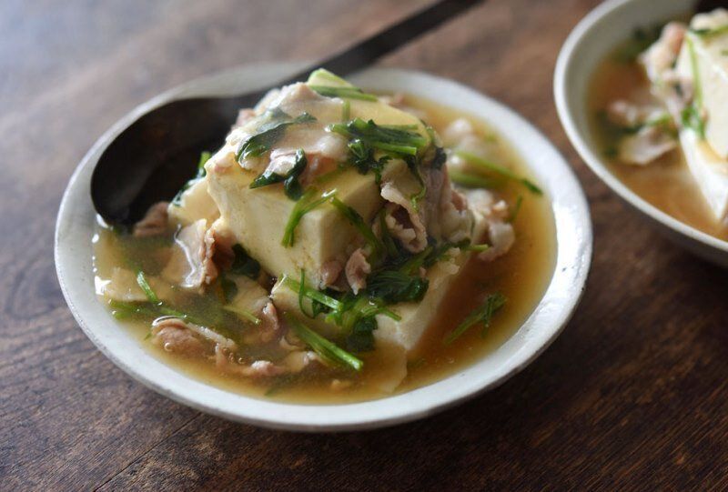 塩を加えた湯で豆腐を温め、だし汁を火にかけて豚肉に火を通し、しょうがの絞り汁などを加えてとろみをつけたものを豆腐にかければ出来上がり。しょうがの香りが心地よい、ボリュームと食べごたえ満点の一品です。せりなどの香りの強い青菜を使うと、ほどよいアクセントになりますよ。