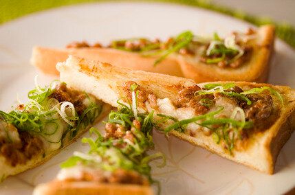 納豆に、たれ、マヨネーズ、鰹節などを混ぜ合わせ、バターを塗った食パンにのせてチーズをかけてトースト、仕上げに刻みねぎを散らしてつくります。ピザのように切り分ければ、片手でつまんで食べやすくなりますよ。和と洋の香りが組み合わさった満足感のある一品です。