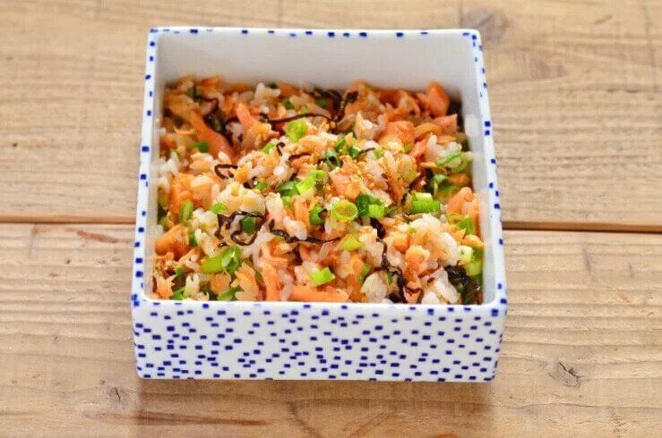 温かいごはんに彩りよく具材を混ぜるだけでつくれます。小ねぎをたっぷり入れることで、香りと辛味が食欲をそそりますよ。たっぷりの鮭で、食べごたえ満点の一品です。