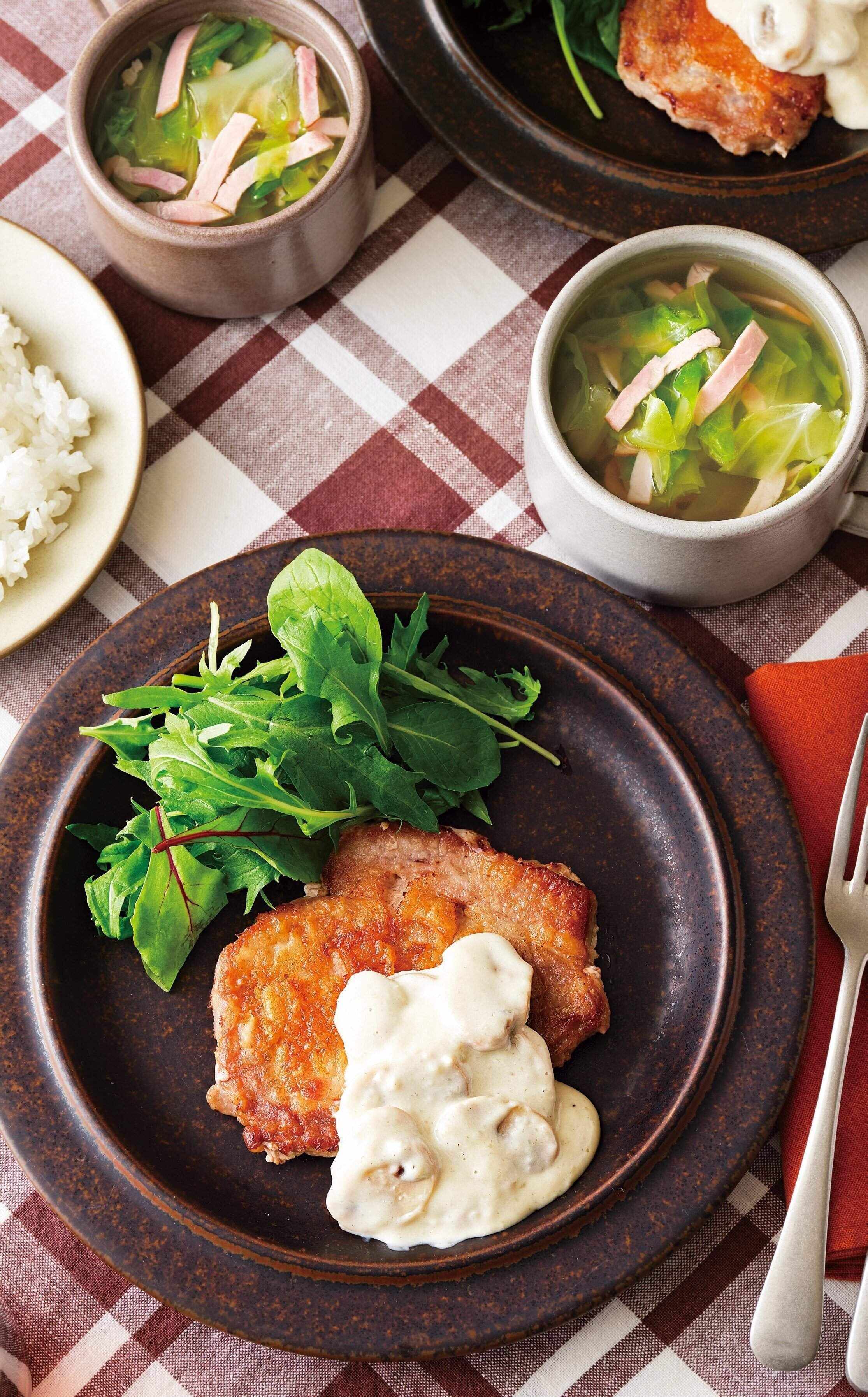 香ばしくてジューシーなポークがたまらない!塩味のあっさりスープも◎。材料を切ったら豚肉を焼き始め、スープの鍋を火にかけます。豚肉がこんがり焼けたら、スープの具を鍋に入れ、きのこソースを作れば20分で2品ができ上がり!