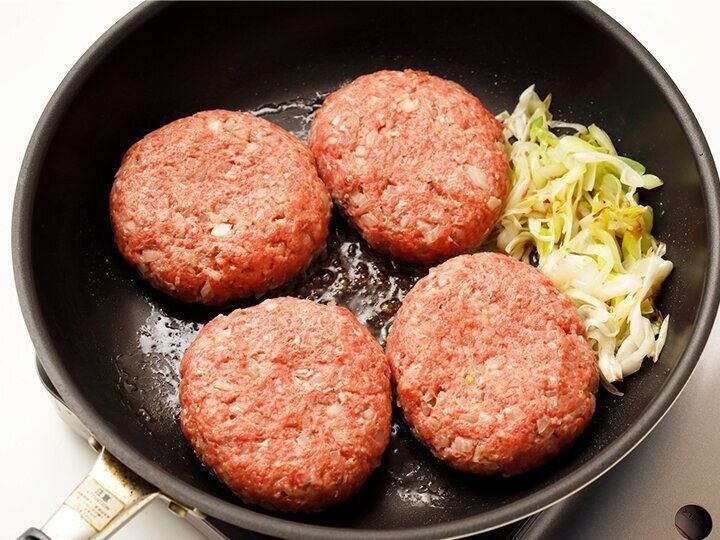 3.ボウルに合いびき肉と2を入れて、粘り気が出るまでよく混ぜ合わせる。4等分して成形する