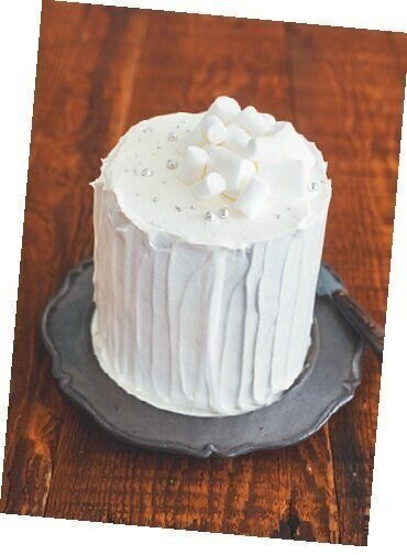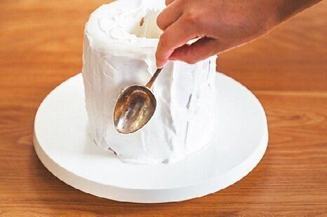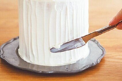 (2)クリームをテーブルナイフで全体に塗る。側面に縦ストライプの模様をつけ、マシュマロ、アラザンを飾る。
