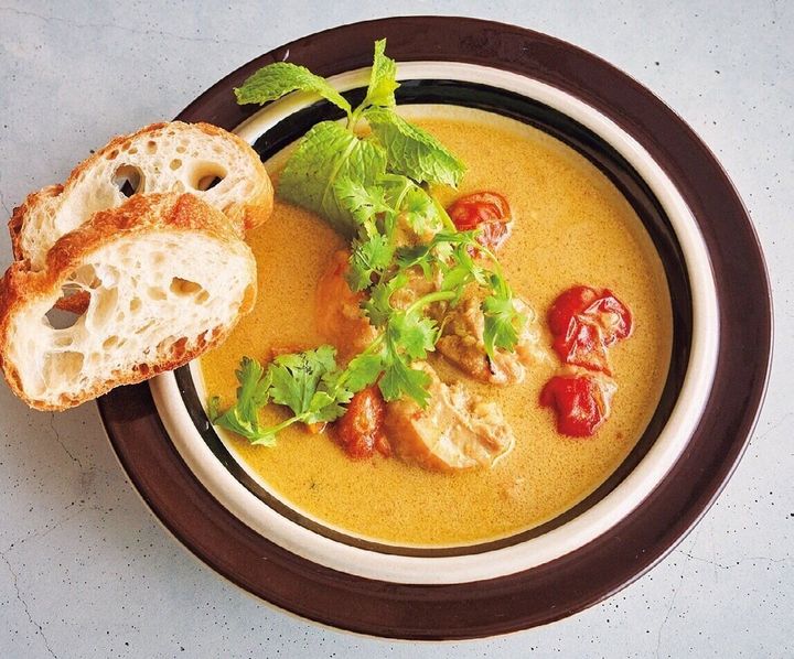 (3)[B]を加えて約10分煮たら、ココナッツミルクを加えて約10分煮る。器に盛り、好みでパクチー、ミント、バゲットを添える。