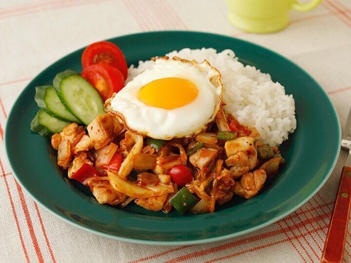 4.器にご飯をよそい、2をかけて3をのせ、つけ合わせを添える。卵をくずしながらいただく