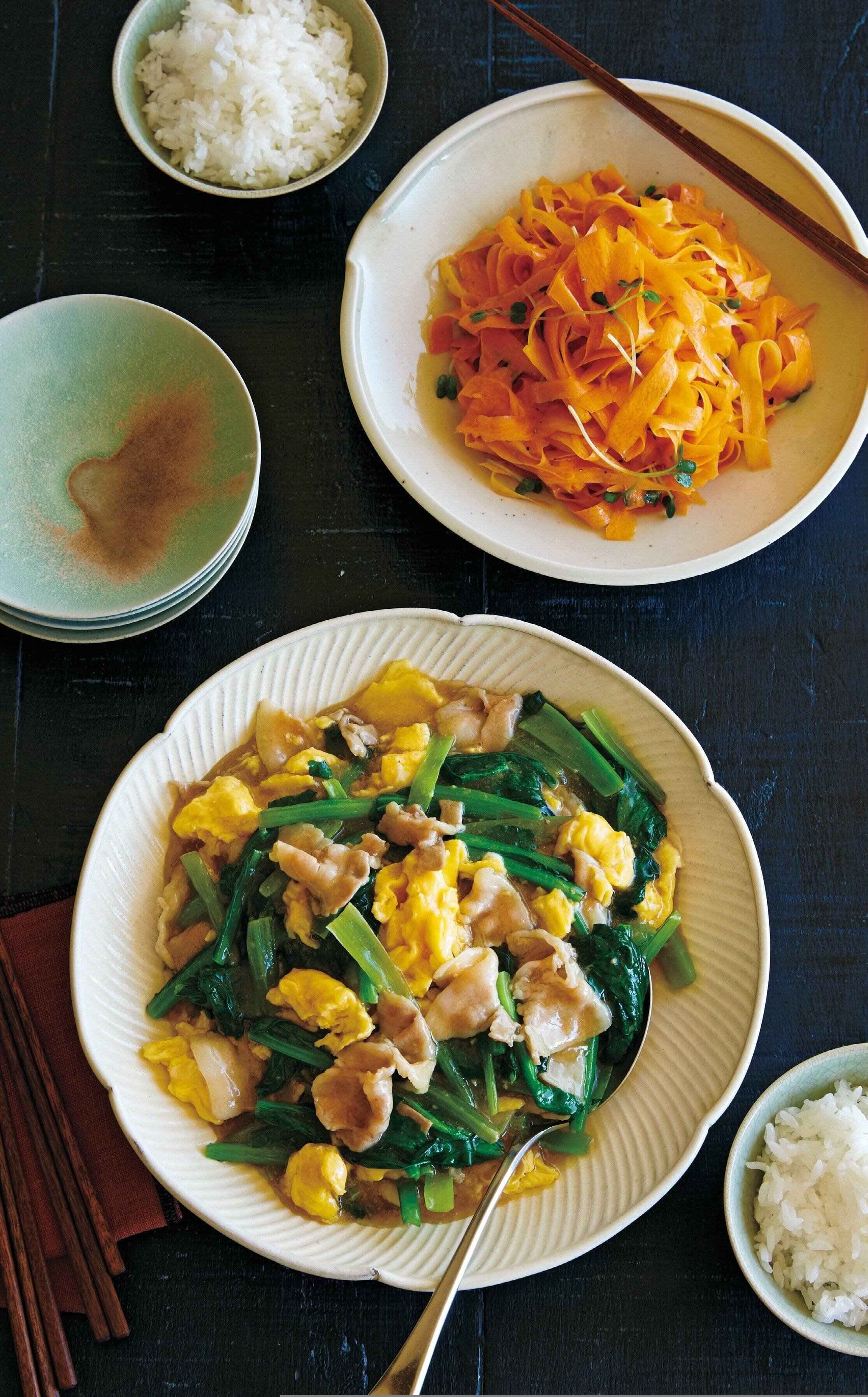 市瀬さん 小松菜の葉はすぐ火が通るので軸のほうを先に加えて炒めるといいですよ。主菜に青菜を使っているので、副菜は根菜のにんじんのあえものにすると、バランスがよい献立になると思います。