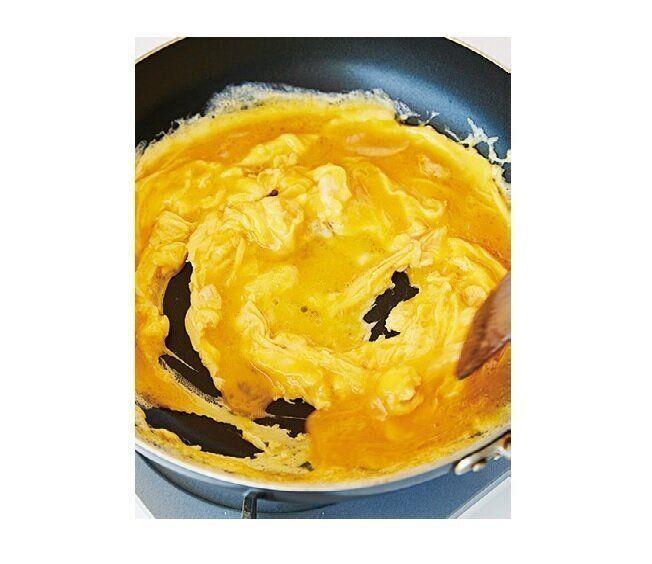 フライパンにサラダ油大さじ2を強めの中火で熱し、卵液を流し入れる。大きく混ぜ、半熟状になったら一度取り出す。