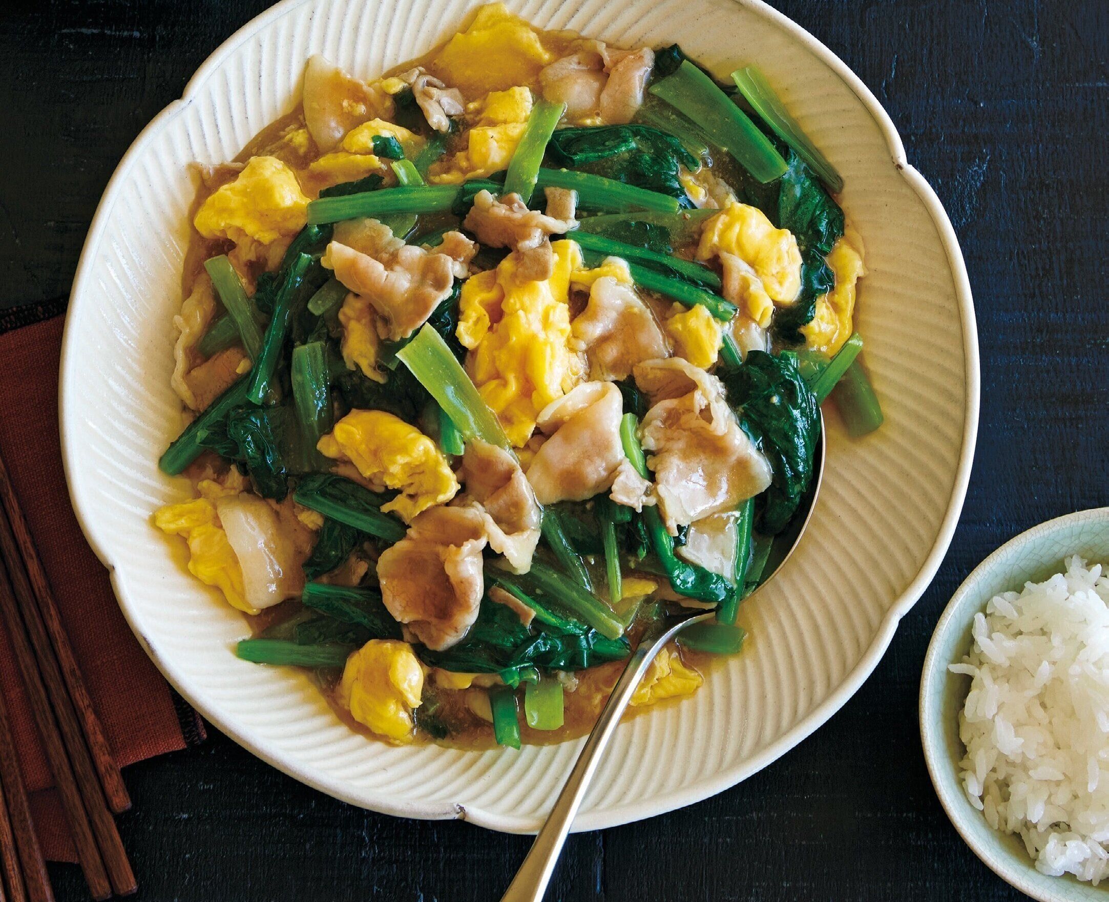 豚肉と小松菜の卵あんかけ炒め