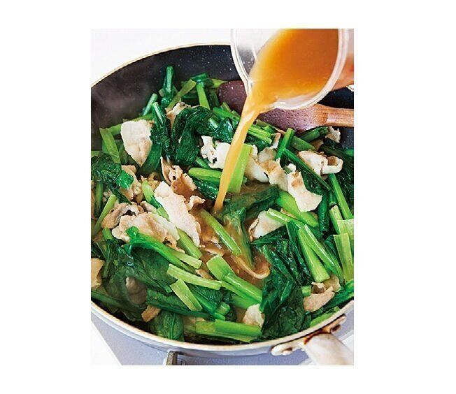フライパンにサラダ油大さじ1/2をたして豚肉を炒め、肉の色が変わったら小松菜の軸のほうを入れ、しんなりとするまで炒める。小松菜の葉を加えてさっと炒め、[A]を加える。強火にして混ぜながら火を通し、とろみがついたら卵を戻し入れ、さっと混ぜる。