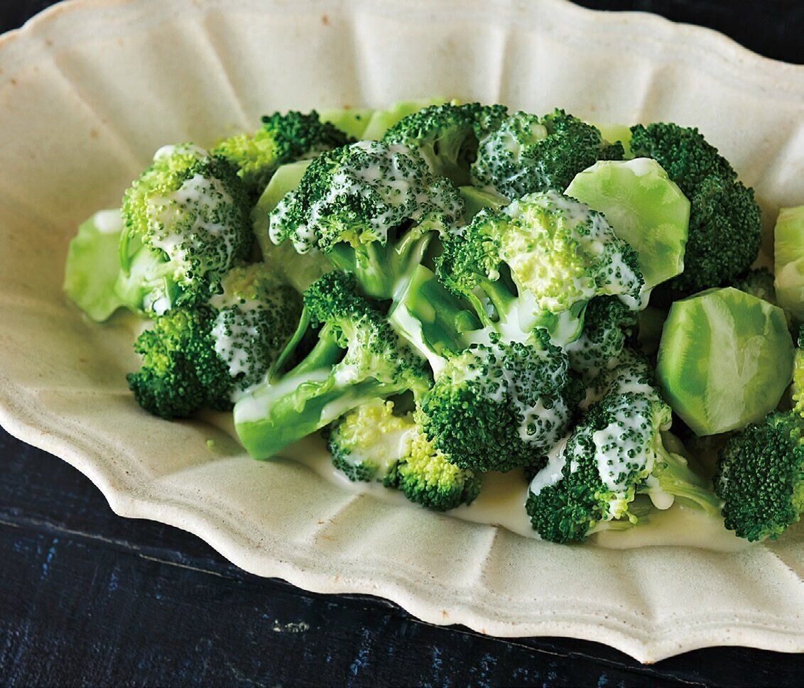 ブロッコリーは小房に分け、茎は皮を厚めにむき幅5mmの輪切りに。耐熱皿に広げ入れ、塩小さじ1/4、水大さじ3をふってふんわりとラップを掛け、電子レンジで約4分加熱し、水けをきって器に盛る。耐熱ボウルにスライスチーズを2cm大にちぎって入れ、牛乳を加え、ラップなしで電子レンジで1分加熱する。混ぜてなめらかにし、ブロッコリーにかける。