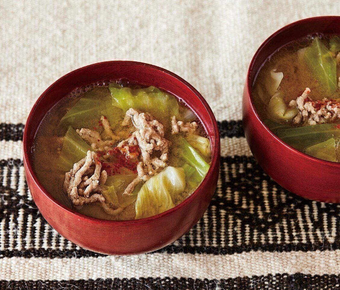 キャベツは小さめの一口大に切る。鍋にだし汁を入れて中火にかけ、煮立ったらキャベツ、ひき肉を加え、キャベツがしんなりとするまで約7分煮る。みそを溶き、器に盛り、一味唐辛子をふる。
