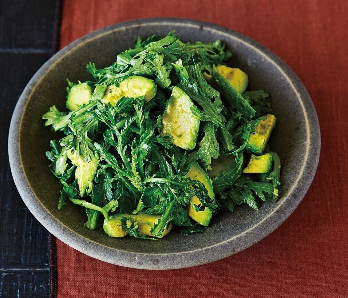 香り高い春菊、ごま油、アボカドはくせになる組み合わせ
