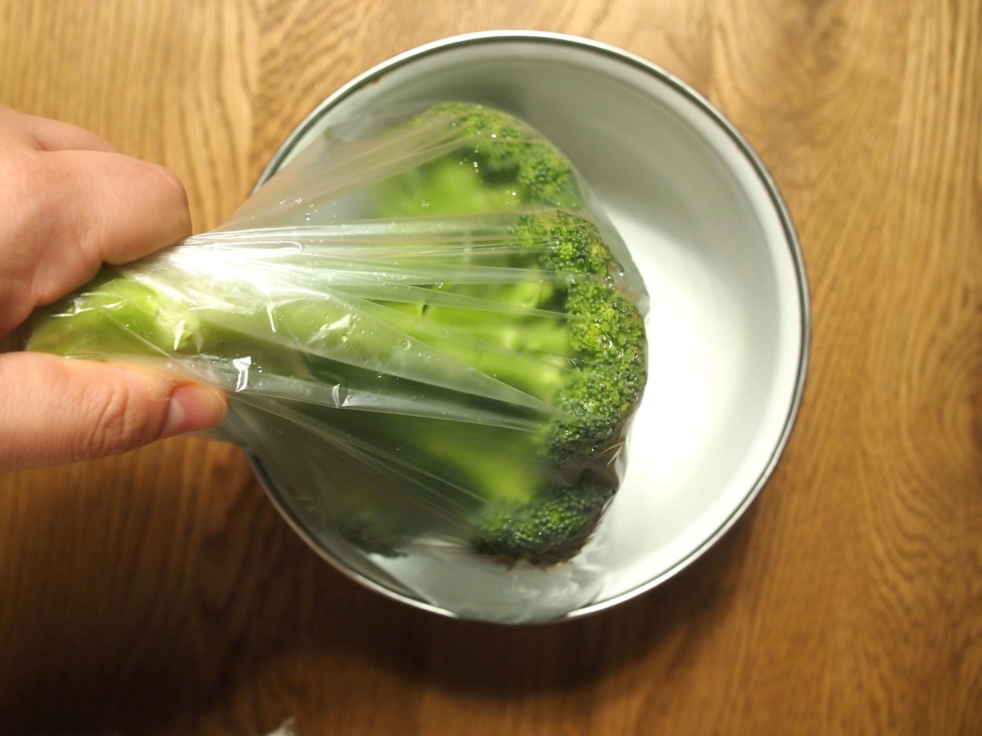 まずは、ブロッコリーをポリ袋に入れ、その上から蕾の部分が浸るほどの水を入れました。水が漏れないようクリップで袋とめて準備完了です。