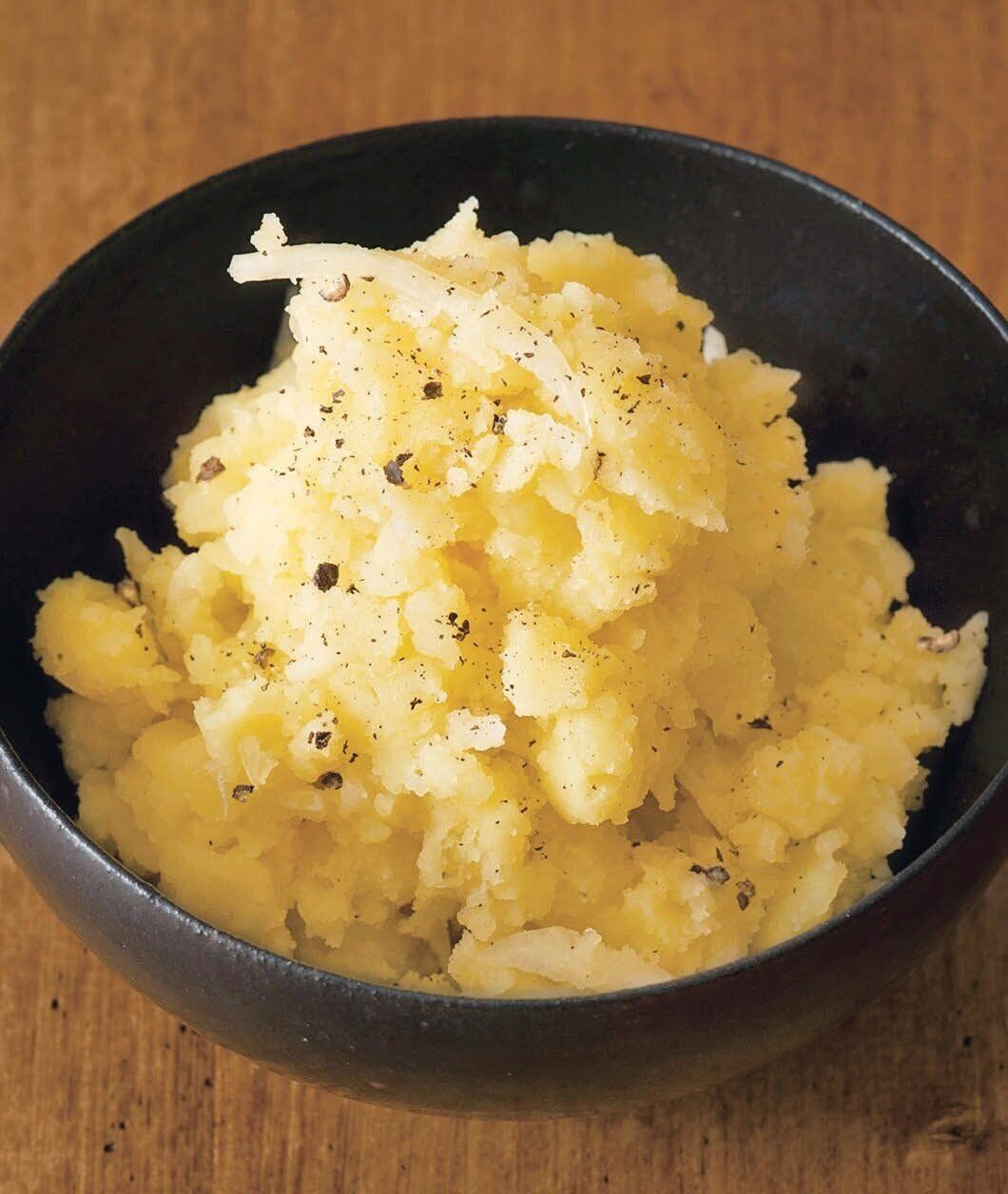 じゃがいもは耐熱皿にのせてラップを掛け、電子レンジで3~4分加熱する。粗くつぶしてボウルに入れ、水けを絞った玉ねぎ、[A]を加えて混ぜる。器に盛って、黒こしょう適量をふる。