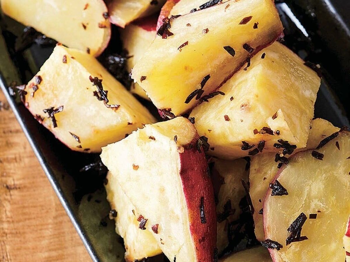 さつまいもは皮つきのまま小さめの乱切りにし、さっと水にさらす。水がついたまま耐熱皿にのせ、ラップを掛けて電子レンジで約5分加熱する。塩昆布、ごま油を加えてあえる。