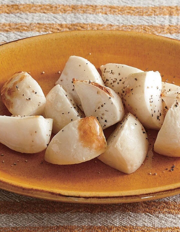 かぶは皮つきのまま6等分のくし形切りにし、オーブントースターの天板にのせて塩少々、オリーブ油大さじ1/4をなじませて、オーブントースターで約8分、少し焼き色がつく程度に焼く。器に盛りつけ、オリーブ油大さじ1/4を回しかけ、黒こしょう少々をふる。