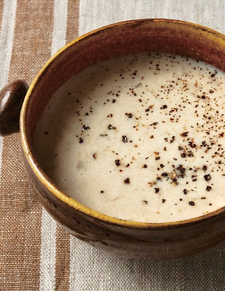 里いもは厚さ1cmほどの半月切りにする。鍋にバターを溶かし、玉ねぎを炒める。しんなりしたら里いもを加えてさっと炒める。水300mlを加えて煮立て、里いもが柔らかくなるまで煮て、木べらなどでよくつぶす。牛乳を加え、さらに2~3分混ぜながら煮る。塩、黒こしょうで味をととのえる。