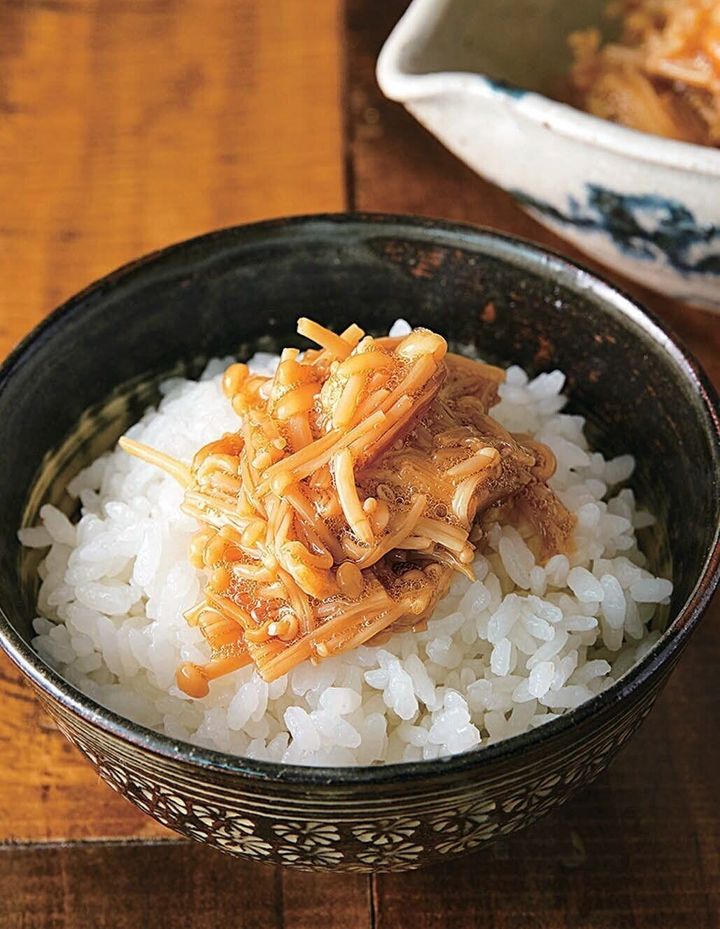 鍋にえのきだけ、[A]を入れ、弱めの中火にかける。菜箸で混ぜながらひと煮立ちさせ、ふたをして7~8分、汁けがなくなるまで煮つめる。塩少々で味をととのえ、ごまをふる。