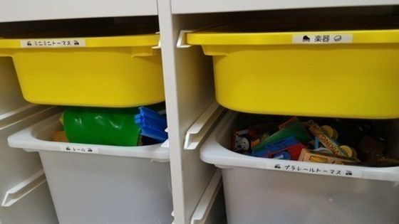 そして、おもちゃは1アイテム1ボックスをおすすめしています。おもちゃごとにお部屋があると仲間分けの知識も身に付きますね。ボックスは色分けしたり、入っているおもちゃの絵や写真をラベル付けしてあげると小さい子でも一目でお部屋を見つけやすいです。