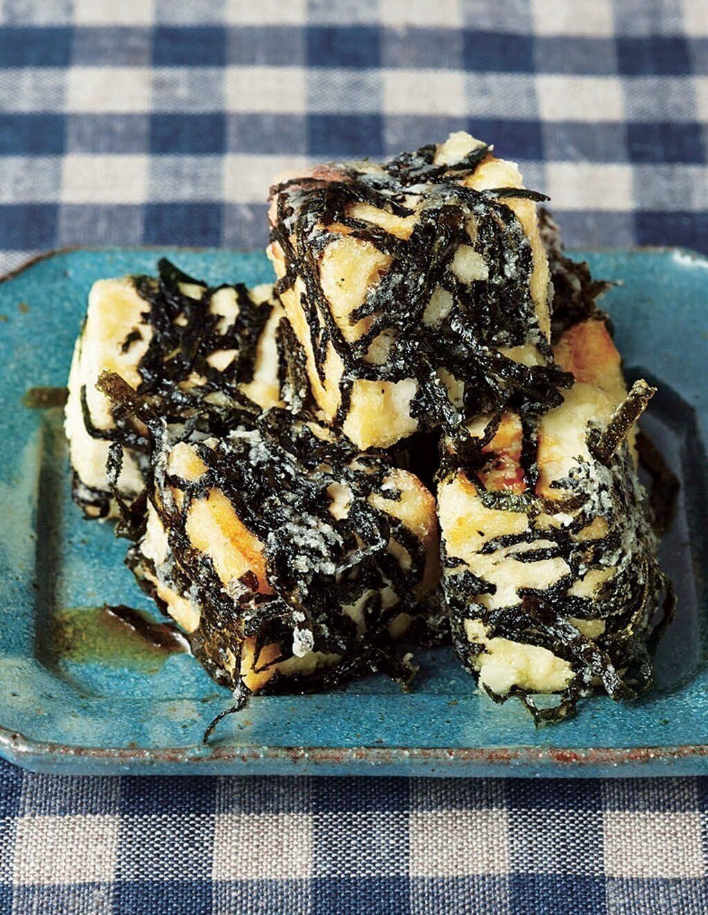 豆腐は3cm角に切る。刻みのりを全体にまぶしつけ、片栗粉を薄くまぶす。フライパンにサラダ油を中火で熱し、豆腐を並べて全面をさっと焼き、バターを加えてからめる。好みでしょうゆをかけたり、辛子じょうゆをつけて食べる。