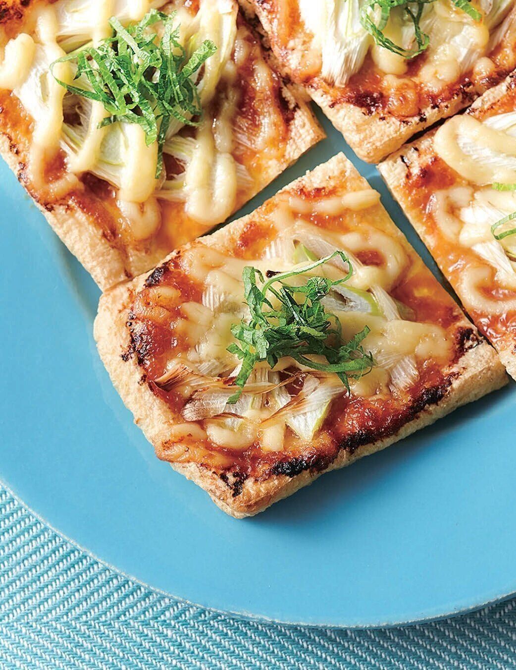 油揚げは半分に切る。[A]を混ぜて油揚げに塗り、ねぎをのせ、マヨネーズを線状に絞る。オーブントースターでマヨネーズがこんがりとするまで10分ほど焼き、青じそをのせる。