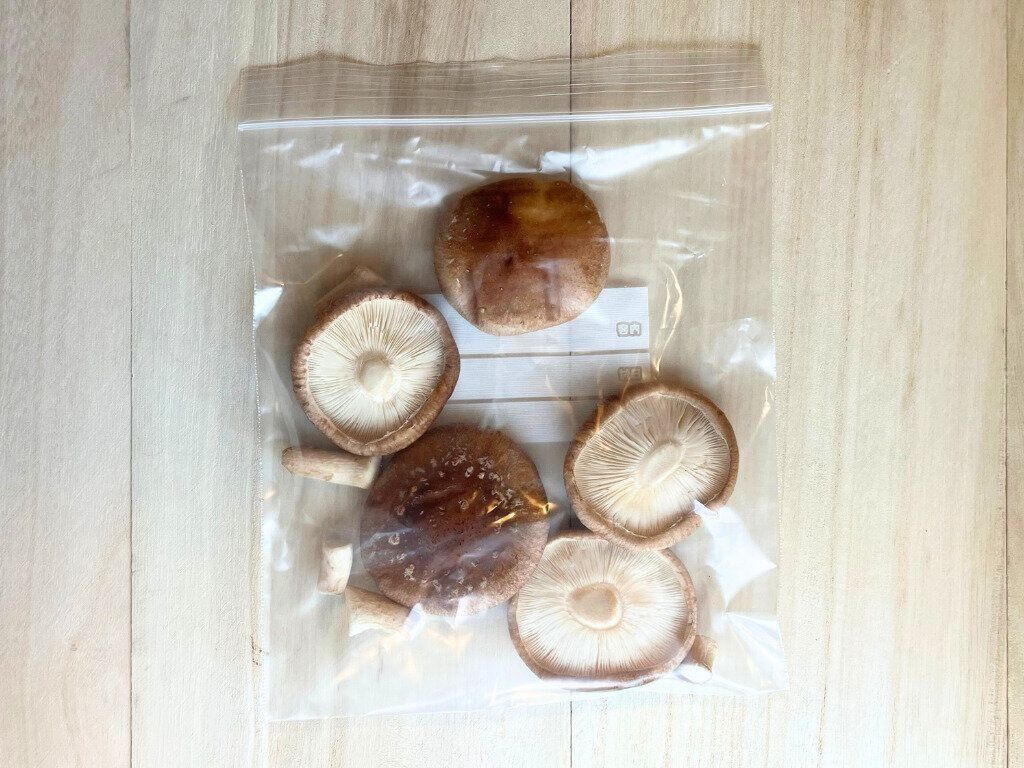 まずは、スーパーで販売されていたごく普通の椎茸を準備してきました。かさの部分と石づきの部分をカットしてチャック付き保存袋へ入れて冷凍庫へ。