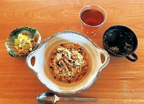 金曜の鶏手羽元の残りを使ったリメイク炒飯、金曜の残りのポテトサラダ、わかめスープ