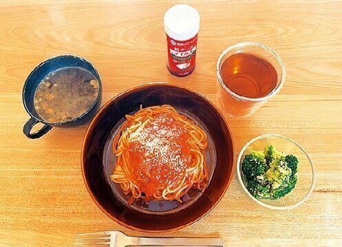 レトルトソースを使ったナポリタン、ブロッコリーの白だしあえ、インスタントのオニオンスープ