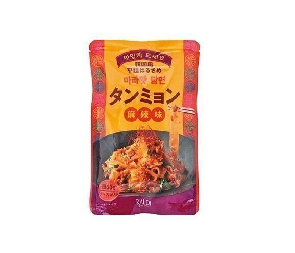 韓国で大人気!ゆでた平たい春雨を旨辛麻辣ソース、具材と絡めるだけ。極上のつるモチ麺で食感が楽しい~。
