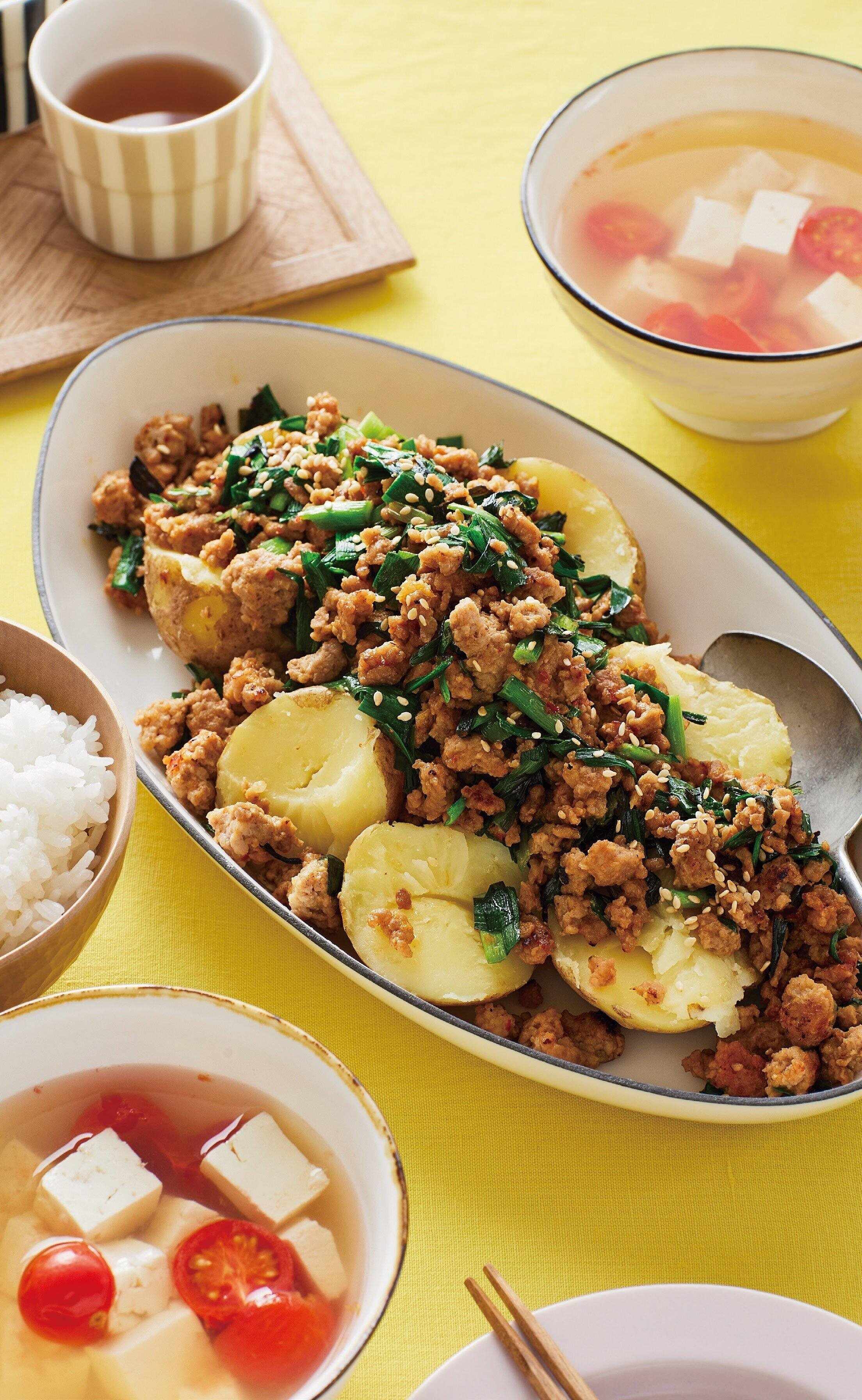 ほくほくしたじゃがいもがひき肉炒めとよく合う!塩味のスープですっきりと♪まず新じゃがを電子レンジにセット。材料を切り、スープの鍋を火にかけたら、主菜のひき肉を炒めます。早く火が通る食材ばかりなので、20分で2品が完成!