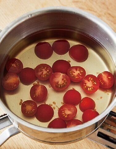 ミニトマトは半分に切る。豆腐は3cm角に切る。鍋にだし汁とミニトマトを入れ、中火にかける。
