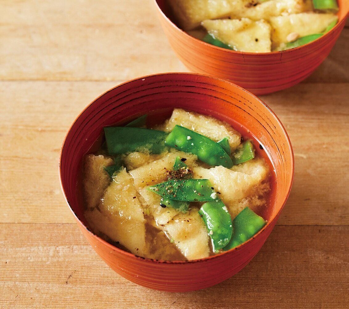 きぬさやは長さを半分に切り、油揚げは三角に切る。鍋にだし汁を入れて火にかけ、煮立ったらきぬさや、油揚げを加えてさっと煮て、みそを溶く。器に盛り、七味唐辛子をふる。