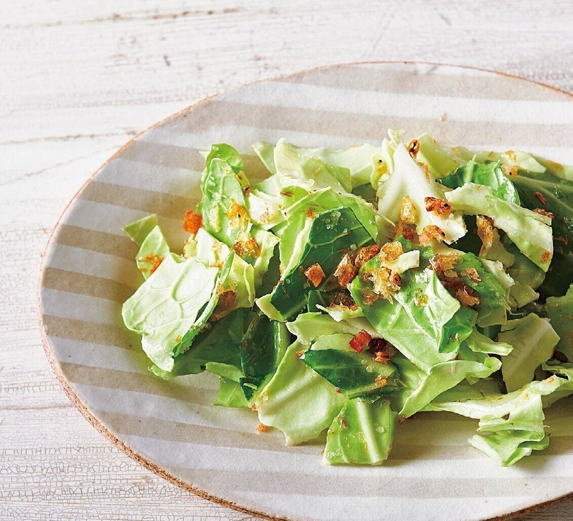 桜えびはさっとからいりし、粗く刻んで塩小さじ1/2を加えて混ぜる。キャベツをちぎって塩桜えびと混ぜて器に盛り、ごま油を熱して回しかける。