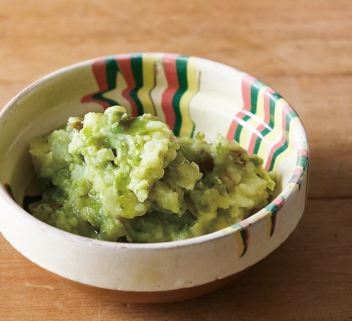 じゃがいもは皮つきのまま3cm角に切って鍋に入れ、グリーンピース、ひたひたの水を加えて中火にかける。じゃがいもが柔らかくなるまでゆで、つぶしながら水分をとばす。[A]を加えて弱火で全体がなめらかになるまで混ぜる。