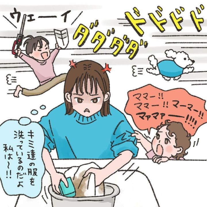 カレーやトマトソースの食べこぼし、どろだらけのユニフォームや靴下は、つけ置きしたり、こすり洗いなどの予洗いが必要なことも。洗濯物を仕分けしたり、予洗いが必要か汚れ具合を見て判断するのも結構手間とエネルギーが必要で、ストレスの原因になっちゃう。さらに、一生懸命洗っているときに限って、子どもの「ママ~、こっち来て!」のリクエストが。求めてくれるのはうれしいけれど、正直、今はやめてほしいなぁ。てか、上の子よ、なぜそんなに騒ぎ立てる? イライラが増すよ。