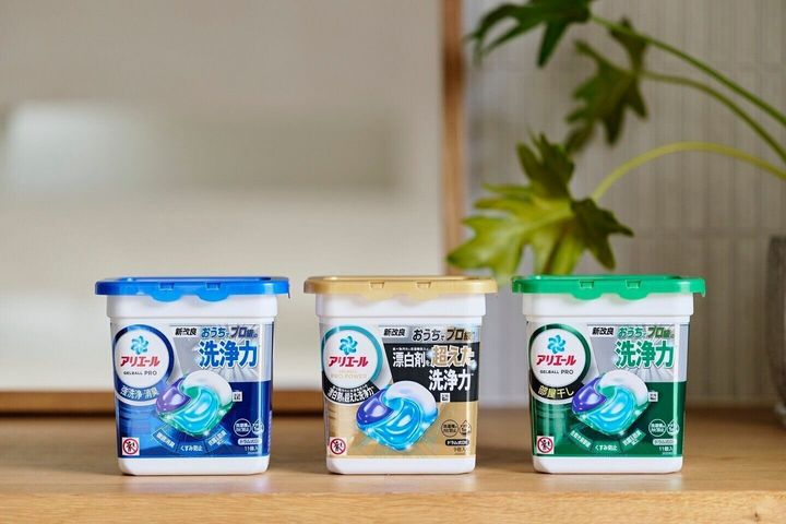 「アリエール ジェルボール プロ」は、3種類のラインアップが。王道のブルー、部屋干し用のグリーン、さらに漂白剤を超えた洗浄力*のゴールド。