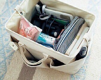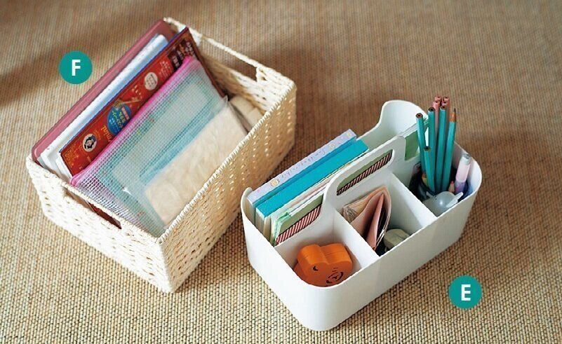仕切り付きで小物の整理に最適。「ごちゃつく娘の文房具類を収納。持ち手があるので、勉強する場所にさっと移動可能」。