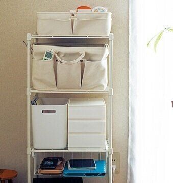 中身が見えないので、雑多な物をポンポン入れておくのにぴったり。「これがあると、片づけがラクです」。おむつ収納としても人気。
