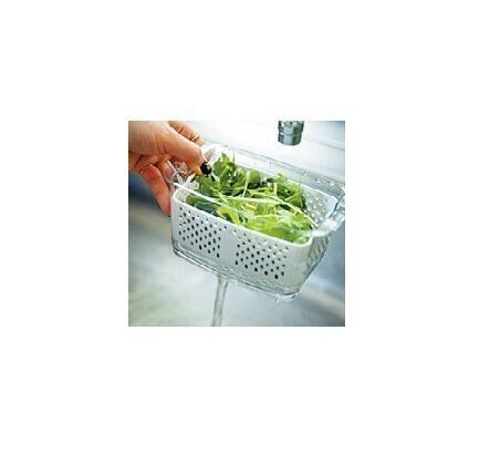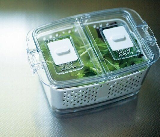 1つの容器でつけ置き洗い、水切り(底面に水抜き穴あり)、保存が可能。「上面に空気を入れ替えできる換気口があって、鮮度がキープできます」。