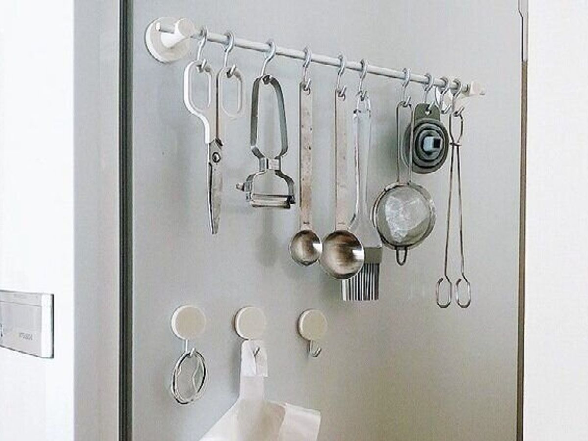 冷蔵庫の側面にタオルハンガーを貼り、キッチンツール掛けに。アルミフックには、ビニールや輪ゴムを。コンロ近くなので、調理がはかどる!