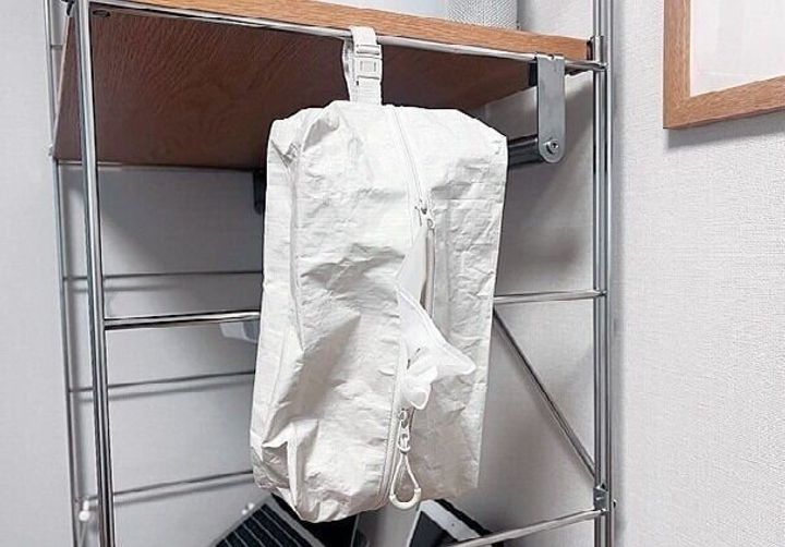 意外と置き場に困るティッシュケース。掛けるタイプなら省スペース。「素材がポリエチレンなので、汚れてもさっと拭けばOKです」。